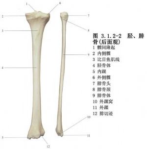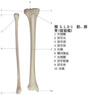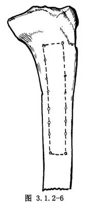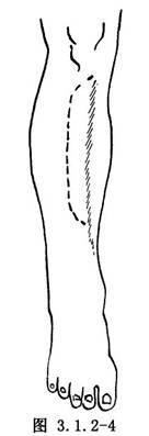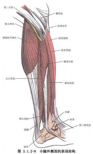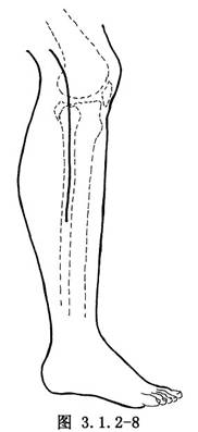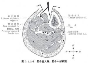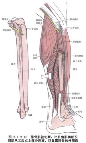 (1)切口:在小腿前外侧做一弧形切口(图3.1.2-4)。因其下有肌肉组织,可避免术后瘢痕与骨面粘连。手术入路的解剖见图3.1.2-5。