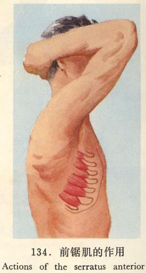 前锯肌是整个躯干中最美丽的肌肉,发展前锯肌可以使体格整体外观获得巨大的不同。当完全发展时,他们就象一排排对称的绳索,在腋窝下方,从背阔肌前缘展开,覆盖在肋间肌上方,最后插进腹直肌中。他们为上体增加了线条,同时创造了更多的肌肉外观。不用惊讶,他们也会很容易被厚厚的皮下脂肪所覆盖。当完全展开时,他们就象六块清晰的腹肌一样性感和壮观。他们在大多数的上肢动作中具有重要的功能,无论推还是拉。
