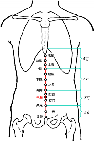 气海为经穴名(Qìhǎi CV6,RN6)[参考资料] 高忻洙,胡玲主编.中国针灸学词典[M].南京:江苏科学技术出版社,2010:145.。出《脉经》。别名脖胦(《黄帝内经灵枢·九针十二原》),季胦(《针灸学》(南京)),丹田(《脉经》),下肓(《针灸甲乙经》),肓之原(《黄帝内经灵枢·九针十二原》),下气海(《针灸学》(南京))。属任脉[参考资料] 高忻洙,胡玲主编.中国针灸学词典[M].南京:江苏科学技术出版社,2010:145.。气海是肓的原穴[参考资料] 高忻洙,胡玲主编.中国针灸学词典[M].南京:江苏科学技术出版社,2010:145.[参考资料] 中医药学名词审定委员会. 中医药学名词(2004)[M].北京:科学出版社,2005.。气即元气,海乃深大也,此穴为元气汇聚之处,故名气海[参考资料] 高忻洙,胡玲主编.中国针灸学词典[M].南京:江苏科学技术出版社,2010:145.。气海穴主治少腹、腰骶等疾患:如腹痛,腹胀,泄泻,胃下垂,脱肛,遗尿,遗精,阳痿,月经不调,痛经,崩漏,阴挺,尿潴留,肠麻痹,神经衰弱,便秘,疝气,经闭,虚脱,胃脘胀痛,呃逆,呕吐,泻痢不禁,水谷不化,闭经,带下,不孕,产后恶露不尽,胞衣不下,产后腹痛,早泄,滑精,癃淋,癥瘕,中风脱证,中暑,虚劳羸瘦,四肢厥冷,五脏气虚,腰痛,厥逆,尿路感染,肠梗阻,下腹疼痛,中风脱症,脘腹胀满,气喘,心下痛,脏器虚惫,真气不足,四肢力弱,奔豚,失眠,肠炎等。