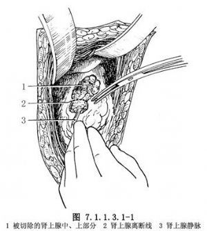肾上腺中、上部分切除后,观察保留部分的色泽,如呈鲜红色,则判定血循环良好,术后能保持良好功能。创面可有少量出血,可压迫止血,不必缝合结扎,使腺体组织遭到破坏。手术部不必置引流。缝合后腹膜,复位内脏。