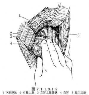 切除并保留左肾上腺,再探查、切除右侧肾上腺。右侧肾上腺静脉短而直接汇入下腔静脉,须将肝、胆囊牵向外、上,打开后腹膜将十二指肠拉向内、下,将肾上极游离、下拉,部分腺体上部居于腔静脉后方,将腔静脉外缘翻起,始能暴露出整个肾上腺及其静脉与腔静脉的汇合部(图7.1.1.3.1-2)。以无损伤性组织钳抓起腺体上部并向上牵拉翻起。分离显露清楚肾上腺静脉,丝线贯穿缝扎1次后,切断肾上腺静脉,完整地切除右侧肾上腺(图7.1.1.3.1-3)。