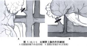 腹腔镜肾上腺切除术有两种途径:①经腹腔切开后腹膜途径;②腹膜后建立人工腔隙途径。两种路径各有优缺点,采用何种径路一般取决于手术医师的操作经验。