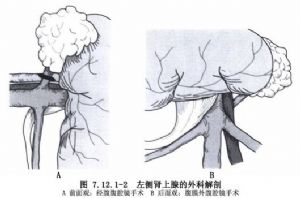 2.库欣综合征 腺瘤或肾上腺增生引起的库欣综合征一侧肾上腺全切,对侧肾上腺部分切除。