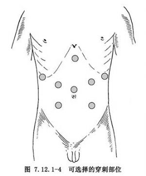 (4)腹腔镜直视下在相当于脐与剑突连接中点偏向患侧腋前线作小切口,置放第2根套管针,变换体位使之向健侧倾斜60~70°,在侧腹壁腋中线与脐平行处放置第3根套管针,必要时可在髂前上棘与脐连线的中点、剑突与脐连线的中点放置第4、第5根套管针(图7.12.1-4)。可根据手术种类不同而分别选择不同的部位,并可根据手术需要,分别置入5mm、10mm、12mm套管针。