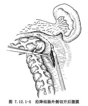 (5)由于体位关系,肠管均沉向下方,可见结肠肝曲或结肠脾曲,沿该处切开后腹膜进入右或左腹膜后间隙。