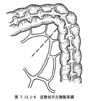 (1)沿降结肠外侧切开后腹膜,上至横结肠上方结肠脾曲,下至乙状结肠,把结肠向内向下分离(图7.12.1-5)。亦可直接切开左结肠系膜(图7.12.1-6)。