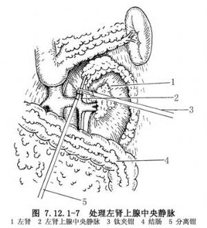 (3)沿左肾静脉上缘寻找左肾上腺中央静脉,游离后用3个钛夹止血。切断左肾上腺中央静脉,近心端保留2个钛夹(图7.12.1-7)。