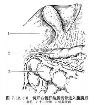(1)沿升结肠右侧切开后腹膜,将结肠肝曲推向内侧,或沿横结肠肝曲切开右侧肝结肠韧带,推开网膜、横结肠,将肝脏向上牵引(图7.12.1-8,7.12.1-9)。