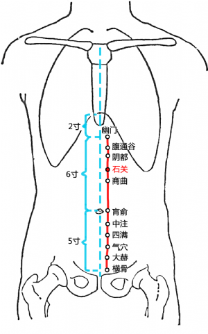 标准定位:石关穴在上腹部,当脐中上3寸,前正中线旁开0.5寸[参考资料] 中医药学名词审定委员会. 中医药学名词(2004)[M].北京:科学出版社,2005.。