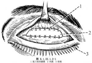 4.术前测定的眼睑退缩量(如病侧睑裂比健侧高3mm,则退缩量即为3mm)加4mm作为巩膜片的高度,用9-0尼龙线做3对褥式缝合,将保存的巩膜缝于提上睑肌腱膜及Müller肌复合体上。拆除临时缝线,再将巩膜片与睑板上缘用9-0尼龙线间断缝合数针(图8.1.22.1.2-1)。