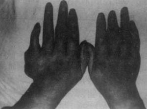 多起病急骤,首次发作常始于凌晨,通常只累及外周个别关节,约50%病例第一跖趾关节为首发关节。在整个病程中,约90%以上病人均有第一跖趾关节受累。关节局部疼痛、皮色潮红,甚至发亮,有时可见静脉扩张和瘀斑,活动受限。局部症状迅速加重,数小时内可达高峰,以至病人辗转反侧,难以忍受。常常伴有全身不适,甚至恶寒颤栗,体温升高。高热者可达39℃以上,伴心动过速,肝脏肿大,明显多尿等症状。初次发作后,轻者在数小时或1~2日内自行缓解,重者持续数日或数周后消退。炎症消退后,局部皮肤呈暗红、偏微紫色,皮肤皱缩,伴有脱屑和轻度搔痒,以后逐渐恢复。