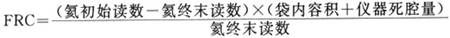残气量指最大呼气末剩余在肺内的气量。功能残气量指平静呼气末剩余在肺内的气量。肺总量指最大吸气末肺内所含的气体量。可以通过单次呼吸法、氮清洗法、氦稀释法和体描仪法进行测定。以氦稀释法为例,测定前,气囊内充入空气和氦的混合气。患者取坐位,夹鼻夹,含口器,与肺功能仪相联。嘱患者平静呼吸,氦分子随每次呼吸进入肺泡,致使气囊内的氦浓度随每次呼吸而降低;而肺泡内的氦浓度则随每次呼吸增高,气体分析仪自动测定每次呼吸的氦浓度,当气囊内氦浓度与肺泡内氦浓度达到平衡1min后,嘱患者做肺活量测定。按下式计算FRC、RV和TLC。