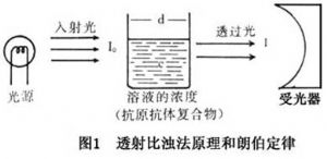 根据朗伯-比尔(Lambert-Beer)定律当光线通过抗原抗体反应系统时,由于溶液中存在抗原抗体复合物,光线被吸收。吸收的量和复合物的量成正比(图1)。