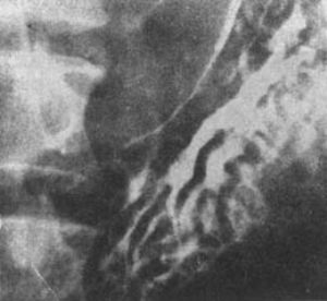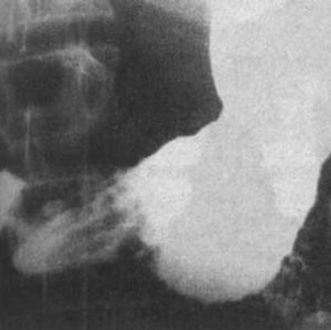 表现气钡双重造影可清楚显示胃轮廓、蠕动情况、粘膜形态、排空时间,有无充盈缺损、龛影等。检查准确率近80%。