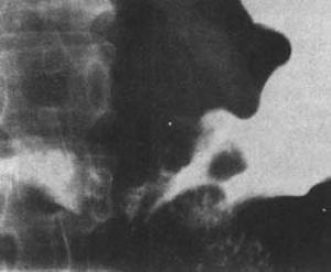 浸润型(图9):局限性者表现为粘膜纹异常增粗或消失,局限性胃壁僵硬,胃腔固定狭窄,在同一位置不同时期摄片,胃壁可出现双重阴影,说明正常蠕动的胃壁和僵硬胃壁轮廓相重。广泛浸润型的粘膜皱襞平坦或消失,胃腔明显缩小,整个胃壁僵硬,无蠕动波可见(图10)。