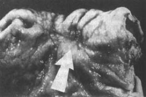 B.胃加压片 显示局限性小片钡剂残留,附近粘膜增粗,胃窦部粘膜亦增粗 | C.胃切除标本 箭头所指为胃癌凹陷区 |