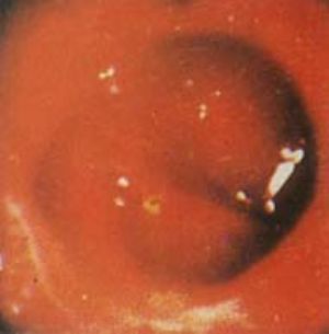 隆起型(彩色图11)主要表现为局部粘膜隆起,突向胃腔,有蒂或广基,表面粗糙,有的呈乳头状或结节状,表面可有糜烂。表浅型表现为边界不整齐,界限不明显的局部粘膜粗糙,略为隆起或凹陷,表面颜色变淡或发红,可有糜烂,此类病变最易遗漏。凹陷型有较为明显的溃疡,凹陷多超过粘膜层(彩色图12)。上述各型可合并存在而形成混合型早期胃癌。