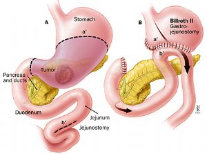 胃切除后,胃空肠吻合可置于横结肠前或横结肠后。食物通过的速度主要取决于吻合口与空肠肠腔的口径,胃空肠吻合口的大小以3~4 cm (2横指)为宜,过大易引起倾倒综合征,过小可能增加胃排空障碍。