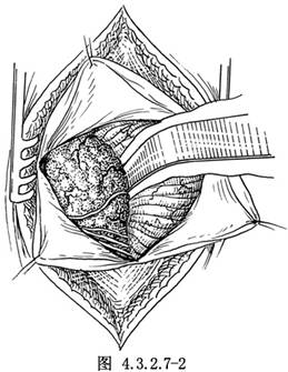 硬脑膜瓣形或放射状切开。按听神经瘤切除术的步骤,先从侧面将小脑半球向中线牵开,显露肿瘤(图4.3.2.7-2)。脑膜瘤呈结节状,瘤体大小不一,表面血管很丰富。尽可能地在切除肿瘤之前逐一将进入瘤体的供血动脉电凝、切断,以减少出血。