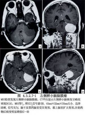 小脑脑桥角是颅内脑膜瘤多发部位之一,约占颅内脑膜瘤的10%左右。肿瘤的基底附着于乙状窦、岩上窦、岩下窦或颈内静脉孔附近。其部位贴近小脑幕,位于小脑桥脑角前上或外侧。肿瘤增大常累及邻近的颅神经并压迫小脑与脑干。有的脑膜瘤向上经小脑幕裂孔向颅中窝生长至鞍背的后方。此类脑膜瘤具有脑膜瘤的共同特点,血运十分丰富。一部分供血动脉由硬脑膜进入肿瘤基底部,一部分直接来自椎基底动脉的分支。由于肿瘤部位很深,瘤体较大并附着于硬脑膜和窦的部位,手术切除有时相当困难,必须显露良好,小心操作和止血。临床表现多有典型的小脑桥脑角综合征,类似听神经瘤,但前庭功能与听力障碍通常较听神经瘤为轻,内耳孔也不扩大(图4.3.2.7-1)。
