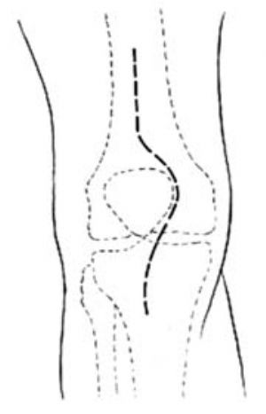 全关节结核需行关节融合者,可直接采用膝关节前侧切口(见[图3]),切断股四头肌腱,向下翻开,切除髌骨,以充分显露关节腔。在清除前侧及两侧的病灶以后,屈膝90°,自关节侧面切断侧副韧带及关节囊,切断交叉韧带,完全分离股骨与胫骨,即可充分显露并切除关节后部的滑膜。检查病灶已彻底清除后,冲洗伤口,即可行关节融合(见膝关节加压融合术)。