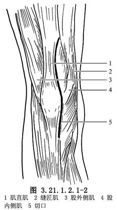 采用膝关节前内侧手术途径。切口起自膝关节之上8~10cm处,沿股四头肌腱内缘向下延伸至离髌骨上缘1.5cm处,再绕髌骨内缘至下缘,逐渐趋向中线,止于胫骨结节的内缘(图3.21.1.2.1-2)。