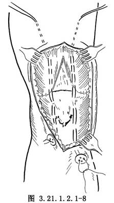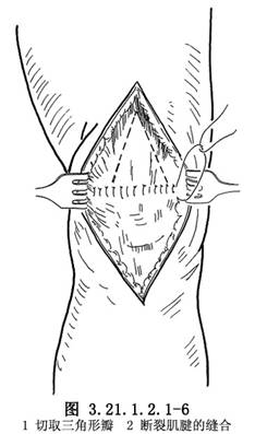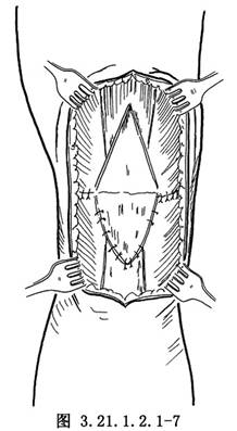 显露断裂肌腱、清除血肿(图3.21.1.2.1-5),伸直膝关节使两断端靠拢,用布巾钳将肌腱近端向远侧牵拉,适当修剪肌腱断端后缝合。然后,从肌腱的近端自前方做一三角形瓣,厚2.4~3.2mm,边长7.5cm,基底宽5.0cm,保留它的基底部在近侧断端上(图3.21.1.2.1-6)。将三角瓣的顶端翻转向远端经过断裂处,给予缝合(图3.21.1.2.1-7)。