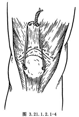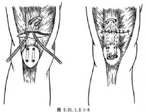 对直接缝合后仍具有一定张力者,于髌骨中下部平面两侧用手摇钻向上各钻直径3mm骨隧道,从健侧股外侧切取1.5cm×15cm的阔筋膜条,横穿于股四头肌断面上方1.5~2cm处,两端分别自髌骨隧道内引出,伸直膝关节,拉紧筋膜条,使股四头肌腱断面充分对合后分别缝合筋膜条及间断缝合肌腱(图3.21.1.2.1-3)。