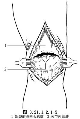 切开皮肤、皮下组织,显露股四头肌腱和髌骨。清除断端血肿和髌上囊内的淤血及液体,修整肌腱断面,注意勿多,以免造成人为的张力过大。