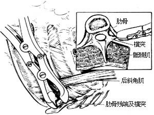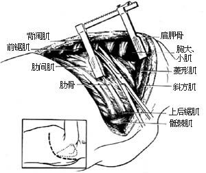 1.体位、切口 侧卧位,术侧手臂消毒包扎后置于身旁,使肩胛骨放松,以利术中将该骨抬起。作后外侧切口,上端起自肩胛骨上缘或肩胛冈平面,沿棘突与肩胛骨内缘间的中线向下,在肩胛骨下角以下约3cm处向前绕过肩胛下角,直达第6或第7肋骨腋中线。