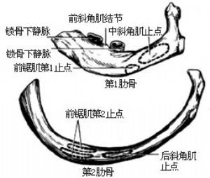 3.识别第1、2肋骨 第1第第2肋骨的外形与其他甩骨不同,二者的上、下侧均增宽成面,内、外侧同变薄成缘,即具上、下面和内、外缘;而其他肋骨则具上、下缘和内、外面。在第2肋骨的中段上面,除有前锯肌附着外,还有后斜角肌附着;第1肋骨的上面有中斜角肌,外缘有前锯肌,内缘结节上有前斜角肌附着。在前斜角肌结节前有锁骨下静脉,结节后有锁骨下动脉,紧贴第1肋骨转向腋窝。在显露第2和第1肋骨时,必须将这些肌肉附着点切断;在切前斜角肌时,必须十分注意,以免损伤锁骨下动、静脉,造成大出血的危险[图2-2、3]。