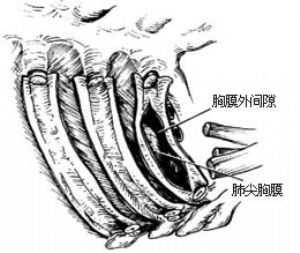 胸膜外胸廓成形术是在骨膜下切除一组肋骨,使局部胸壁塌陷,以缩小该部位胸腔的手术。术后6~8周从骨膜新生的肋骨将保持局部胸壁塌陷,使胸腔永远缩小。