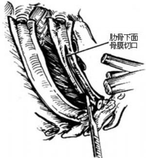 切除肋骨的数目和长度应根据病变范围而定,一般需要切除5~6条肋骨。如需切除5条以上肋骨时,应根据病人体质分两期或三期完成。一般多作两期手术:第1期切除第1~3(或第4)肋骨;第2期切至第7或第8肋骨。每一肋骨切除的长度,也因肋骨的斜行走向而不同。肋骨后端应尽量贴近椎体切断,包括将横突切除,以消灭椎体旁沟,使肺部被彻底压缩。第1肋骨后段在肺尖平面以上,可以保留较长,而且不必切除横突。第1肋骨前端应在靠近胸骨缘切断,下面的肋骨前端可以逐渐延长保留一段;第3肋骨切至肋骨软骨关节;第7肋骨切至腋中线。这样可使胸廓在同一平面塌陷。