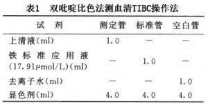取血清(浆)1ml,加入铁标准应用液1ml,混匀,放置5min后加入碳酸镁粉剂200mg混匀,置室温30min,每10分钟用力混合一次。以2500转/分,离心10min,吸取上清液1ml按表1操作。