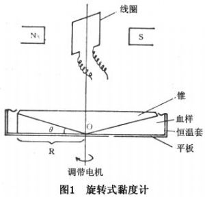 旋转式黏度计法:常见的旋转式黏度计是同轴锥板式结构,平板部分为样品杯,它与调速马达相连,当平板以某一转速旋转时,转动的扭矩通过血样传递到锥体;血样越粘,传入的扭矩越大(图1)。锥体受力大小由与其相连的测力传感器检测,利用下式可计算被测液体的黏度η: