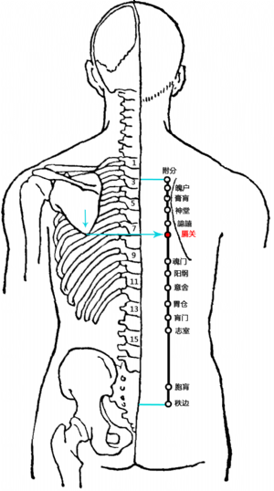 膈关为经穴名(Géguān BL46)[参考资料] 高忻洙,胡玲主编.中国针灸学词典[M].南京:江苏科学技术出版社,2010:736.。出《针灸甲乙经》。属足太阳膀胱经[参考资料] 高忻洙,胡玲主编.中国针灸学词典[M].南京:江苏科学技术出版社,2010:736.。膈即横膈,关即关隘,此穴与膈俞平列,喻之为横膈之气出入的关隘,故名膈关[参考资料] 高忻洙,胡玲主编.中国针灸学词典[M].南京:江苏科学技术出版社,2010:736.。膈关穴主治膈、胃及局部疾患:如呕吐,噎膈,嗳气吞酸,呃逆不止,胸腹满痛,小便黄赤,脊强背痛,浑身骨节疼痛,呕吐,食不下,胸闷,脊背强痛,呃逆,现代又多用膈关穴治疗膈肌痉挛,肋间神经痛,胃痛,胃出血,脊背疼痛,肠炎等。