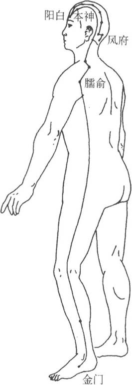 阳维脉起于足太阳膀胱经外踝下之金门穴,从胻骨而上,循背外侧、肩胛、项旁至面,上头后至脑后哑门穴,维络诸阳会于督脉。