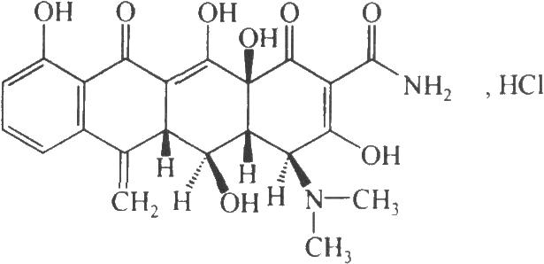 本品为6-亚甲基-4-(二甲氨基)-3,5,10,12,12a-五羟基-1,11-二氧代-1,4,4a,5,5a,6,11,12a-八氢-并四苯甲酰胺盐酸盐。按干燥品计算,含C22H22N2O8不得少于87.0%。