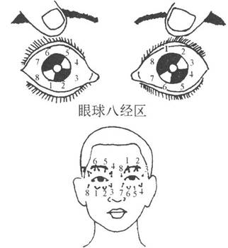 眼针为针灸治疗方法。是指针刺眼球周围、眼眶边缘的穴位,以治疗全身疾病的一种方法。眼穴定位同经穴异。分为八区十三穴。左眼属阳,按顺时针方向排列;右眼属阴,按逆时针方向排列。3、5、8三个经区为上、中、下三焦,每经区以分钟计算占90分钟为一个穴;1、2、4、6、7五个经区为肺、大肠;肾、膀胱;肝,胆;心、小肠;脾、胃;每人经区分为两个穴,占45分钟为一个穴。每个穴位分别主治所代表的脏腑经络所发生的病症[参考资料] 高忻洙,胡玲主编.中国针灸学词典[M].南京:江苏科学技术出版社,2010:627. 。