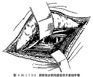 以尖刀环形切开椎间盘,用刮匙及髓核钳清除椎间盘组织,深入2cm左右,保留纤维环后壁(图3.26.1.7.2-3)。用刮匙刮除软骨板直至终板,露出出血的骨面。