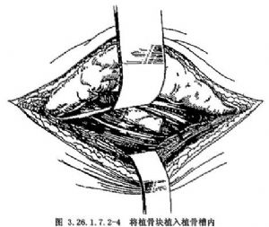 在切口外侧部牵开下方皮肤和皮下组织,由腹外斜肌表面分离,显露髂嵴。在髂棘切取全厚三面皮质骨髂骨6cm×3cm,嵌入植骨床(图3.26.1.7.2-4)。