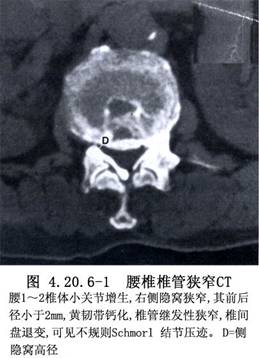 腰椎狭窄是老年常见病,致病因素复杂:有先天性椎管狭窄的因素,亦有因年龄的增长,椎骨、椎间盘变性,导致间盘突出,以及骨赘、骨嵴(bone ridge)形成等继发因素,造成马尾和神经根受压。临床表现主要是:腰腿痛、下肢麻木、无力,走路不稳和间歇性跛行(intermittend claudication)等。Sachs和Fraenkel(1900)报告1例背痛和神经源性间歇性跛行,经椎板切除而缓解。Verbies称此病为腰椎椎管狭窄。Schlesinger(1995)和Epstein(1992)先后提出侧隐窝狭窄(lateral recess stenosis)常与腰椎狭窄和腰椎间盘变性伴发。Javid等(1998)将这些病例情况称为腰椎狭窄或称变性性腰椎狭窄(degenerative lumbar stenosis)。近年来由于影像学检查的发展。多能清晰地显示病变的性质和范围而作出确切的诊断,但由于病变广泛,有的位置隐匿,以致手术难以彻底切除压迫物。一些作者大宗病例的统计分析,减压性椎板切除的疗效仅为2/3,伴有侧隐窝狭窄者疗效更差,需要行第二次手术者占15%左右。故病变的分析和手术操作仍待提高(图4.20.6-1)。