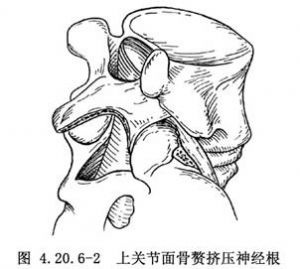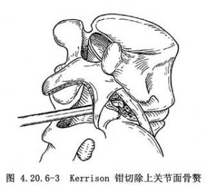 3.减压性椎板切除一般是切除病变椎间隙的上下两个椎板。剪断棘突后,将椎板咬骨钳小心地向上提切除椎板,包括切除关节面的内侧份,以利减压和显露。如仅为先天性椎管狭窄,椎管前后径<12mm,硬脊膜囊前方无骨赘和突出椎间盘等压迫物,则减压手术即告完成。如椎管前后径在15mm以上的正常值,但病变椎间隙有变性椎间盘突出和(或)骨赘形成,导致继发性(或发育性)椎管狭窄,则除做椎板切除外还应考虑硬脊膜囊前方压迫物的处理。如伴发侧隐窝狭窄,应检查侧隐窝的病理变化,在神经根前方和后方有无骨赘,如下腰椎的上关节突增生肥大挤压神经根时(图4.20.6-2),可用高速微型钻磨除或以Kerrison钳切除(图4.20.6-3)。