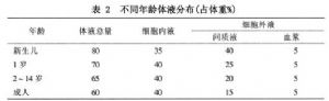 1.小儿体液特点 若按体重计算,小儿体液量比成人多,年龄越小,体液相对越多,主要是间质液量比例较高(表2)。