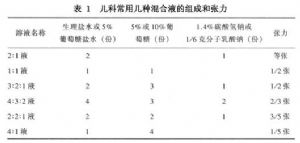②定性质:低渗性脱水补2/3张液体,等渗性脱水补1/2~2/3张液,高渗性脱水补1/3~1/5张液体。如脱水性质不易判断时,可借助血清钠测定,未知结果前可按等渗性脱水处理,儿科常用的几种混合液见表1。