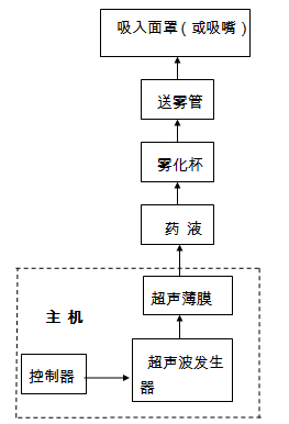 超声雾化器由超声波发生器产生的高频电流经过安装在雾化缸里的超声换能器使其将高频电流转换为相同频率的声波,由换能器产生的超声波通过雾化缸中的耦合作用,通过雾化杯底部的透声薄膜,从而使超声波直接作用于雾化杯中的液体。当超声波从杯底经传导到达药液表面时,液—气分界面即药液表面与空气交界处,在受到垂直于分界面的超声波的作用后(即能量作用),使药液表面形成张力波,随着表面张力波能量的增强,当表面张力波能量达到一定值时,在药液表面的张力波波峰也同时增大,使其波峰处的液体雾粒飞出(雾粒直径的大小随超声波的频率增大而缩小,即超声波频率与雾粒的尺寸成反比)。由于超声波而产生的雾粒具有尺寸均一,动量极小,故容易随气流行走,药液产生雾粒的数量随超声波能量的增加而增多(即超声波的功率与雾粒的数量成正比)。在医用超声雾化器将药液分裂成微粒后,再由送风装置产生的气流作用而生成药雾,药雾经送雾管输送给患者。
