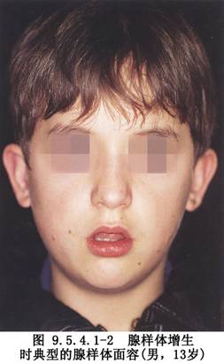 1.增殖体肥大堵塞鼻后孔,致经常张口呼吸,甚至表现为增殖体面容者(图9.5.4.1-1,9.5.4.1-2)。