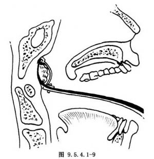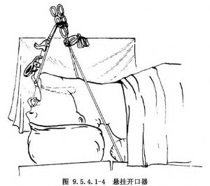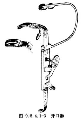 1.术者站在手术台头端,置入附有带槽压舌板的开口器(图9.5.4.1-3)。张开开口器时,注意勿将上唇压在开口器与切牙之间。压舌板应位于舌中部。舌体不要偏向一侧。同时应注意不要压迫或推移气管内插管。手术台如附有悬挂开口器装置,即将开口器悬挂固定(图9.5.4.1-4)。如无悬挂装置,可让助手扶持固定开口器柄(图9.5.4.1-5)。