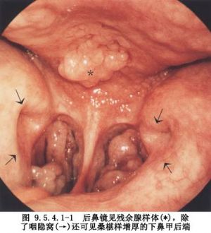 5.5~10min后,将填塞的纱球或纱条取出。如无出血,再以手指伸入鼻咽部探查是否有增殖体残体。如有残体,可用小号增殖体刀或刮匙清除残体,或仍以示指尖做刮推动作,清除残体。后一种方法较为安全,损伤咽鼓管圆枕机会较少,如采用增殖体刀或刮匙清除,应以手指引导,避免损伤咽鼓管圆枕。