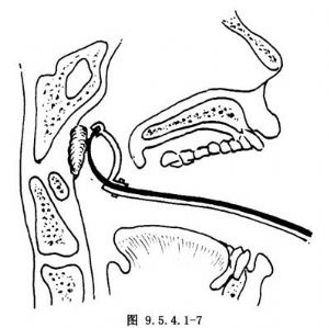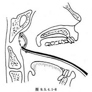 2.术者以一手的示指伸入病人鼻咽部,探查增殖体的大小,咽鼓管圆枕的位置及是否有异常血管搏动,并用示指尖将位于咽隐窝的增殖体组织轻刮,推向中线部,以便切除。